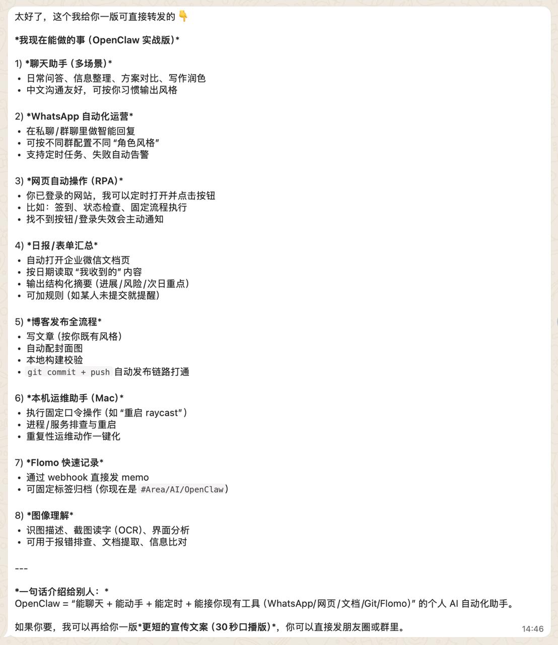 我先确认了一件事:一个账号可以覆盖多个群聊场景。 之后我把主要交互入口收敛到 WhatsApp,减少工具切换和上下文丢失。